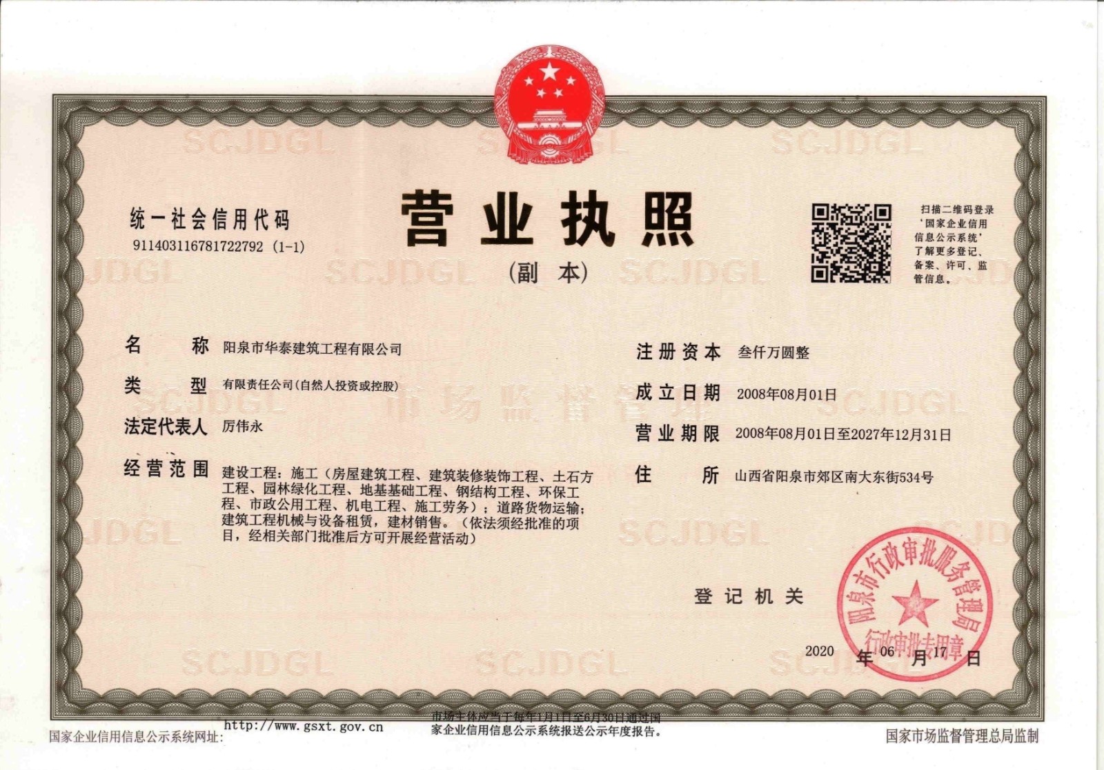 阳泉市华泰建筑工程有限公司成立于二零零八年,经阳泉市工商行政管理局注册登记,具有独立的法人资格。公司地处阳泉市南大东街534号,办公面积780m2。注册资金3000万元,具有建筑工程施工总承包贰级资质、建筑装修装饰工程专业承包贰级和施工劳务资质。